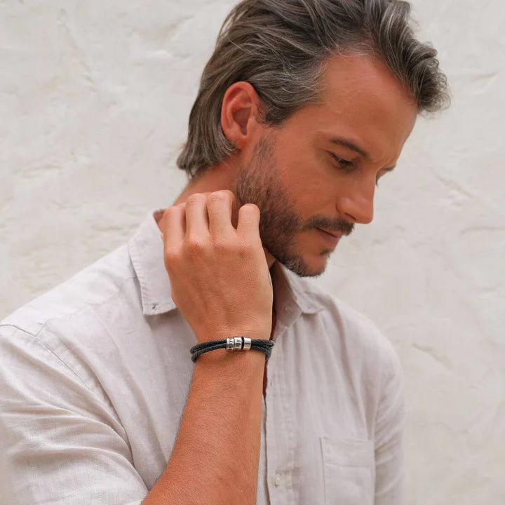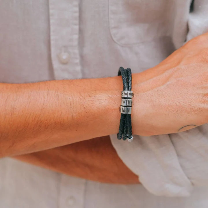 The Black Braided Leather Men's Bracelet provides a luxurious and elegant glow, and you can also add affective value to it by engraving the names of your loved ones.